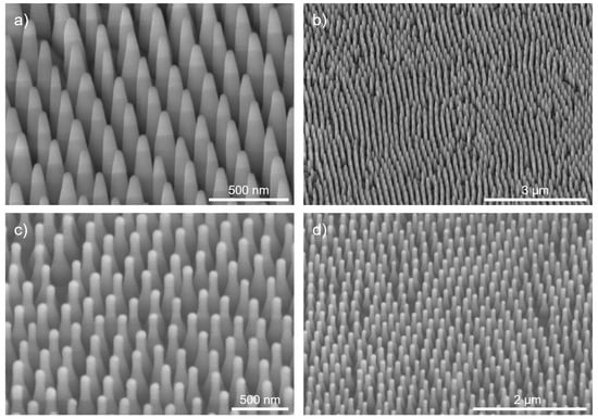 The fabrication process is relatively sensitive towards the substrate material and shape. Transferring the process towards the planoconvex SiO2 lenses requires some adjustments of the process times in the O2-RIE and ICP-RIE steps 2 and 4. The O2-RIE process time was extended from 1 min to 1.5 min, as the etch rate of the shrinkage was lower. The ICP-RIE process time was shortened from 20 min to 15 min. This also resulted in slight changes of the structural profile. The structures on the lens are shown in Figure 7c,d. Instead of a conical profile with a constant sidewall angle, a rather bottle-like profile was formed that was close to the Klopfenstein profile []. Compared to other structural profiles optimized for the optimal coupling of light, the Klopfenstein profile is very effective in light coupling at comparatively low structural heights []. Hence, the structures are very suitable for effective antireflection.
