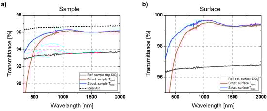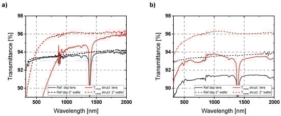 In addition to characterizing the planar substrates, which are well-suited for evaluating optical properties, there were also attempts to measure the structured lens sample. The difficulty here is that the refractive behavior of the lens strongly influences the optical beam path in the spectrometer. To reduce this influence, an aperture of 6 mm diameter was used. The aperture blocks the light that is further away from the optical axis, thus not illuminating the areas where strong refraction by the lens occurs. The aperture and the lens sample were placed at a moderate distance in front of the integration sphere. The problem here was that only the central region of the structured lens could be examined. In that area, structuring effects were already macroscopically visible, which influenced the results. Reducing the size of the measurement field results in noisier and less accurate measurement signals. The measured results are shown in Figure 9a. The transmission dip at around 1.4 µm wavelength is caused by OH− absorption since the used material is UV-grade fused silica in contrast to the IR-grade wafer substrate. Stronger noise is also clearly visible. Apart from that, the values of the reference samples are in a similar range. While the AR effect in the upper wavelength range is still comparable to that of the wafer sample, a drop of the transmittance due to the defects on the lens sample can be seen already at higher wavelengths. Nevertheless, the AR effect based on the AR nanostructures could be principally demonstrated here as well.