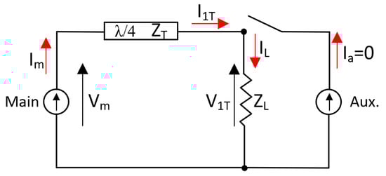 From Equations (2) and (3), we can observe that the impedances ( and ) seen by one current source are controlled by the current level of the other one. Therefore, changing the impedance level seen by one current source results in a variation of the voltage across the impedance R. Now, consider that the ideal current sources are active devices such as transistors (main and auxiliary). To maximize the efficiency of a device (main), while its output load is changing (by the current supplied by the auxiliary device), the voltage swing across it must be maintained constant. To guarantee this condition, a /4 transmission line is added between the load and the main source, as shown in Figure 2.