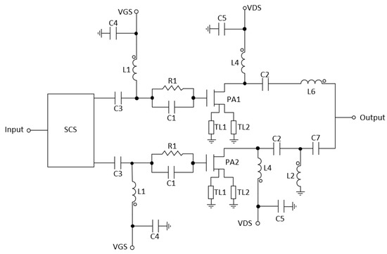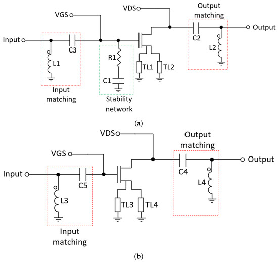 Stability is a crucial part of a PA design, which requires special precautions to avoid unwanted oscillations. In order to avoid such instabilities, an RC network is added in the main amplifier (R1 and C1) [7,21] to make the amplifier unconditionally stable, as seen in Figure 6a. The inductors L1 and L2 and capacitors C3 and C2 are used to match the amplifier for maximum PAE. On the other hand, as shown in Figure 6b, the auxiliary amplifier does not need a stabilization network since it is stable. Inductors L3 and L4 and capacitors C4 and C5 make up the input and output matching networks of the auxiliary amplifier. The transmission lines (TL1-TL4) are used to connect the source of the transistors to ground.