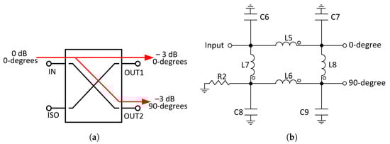 The design of this component is relatively straightforward. The basic configuration is shown in Figure 7a. When power is introduced to the input port, half the power (−3 dB) flows to the 0-degree port (output 1), and the other half is coupled to the 90-degree port (output 2). The reflections from the mismatches are sent back to the output ports and they either flow directly to the isolated port or cancel at the input. This configuration ensures a high degree of isolation between the two output ports and the two input ports without any unwanted interaction between them [22].