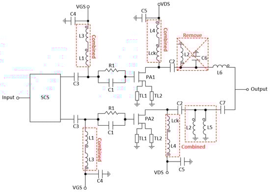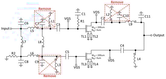 As shown in Figure 8, there are parallel inductors with capacitors that can be eliminated by resizing other passive components. However, it is important to note that these simplifications cannot be made simultaneously. Instead, they have been implemented sequentially, optimizing the PAE after each individual change. Figure 9 and Table 1 illustrate the simplified schematic and the corresponding component values, respectively. In the schematic, Wfg and Nfg represent the width and number of gate fingers of the transistors, while W and L denote the width and length of the T-lines.