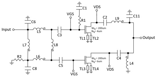 In the first approach, the output network and the input hybrid of the DPA were designed with transmission lines, but due to its large area (7700 μm × 81 μm), they were discarded. Therefore, the output /4 T-line was replaced by a lumped-elements T-line using a -network. This network is composed of capacitors (C10 and C11) and inductor (L9) [23]. Likewise, the input hybrid was implemented with lumped elements using inductors (L5, L6, L7 and L8), capacitors (C6, C7, C8 and C9) and resistor (R2) at the isolated port (see Figure 7b). The resulting schematic of the DPA is shown in Figure 8.