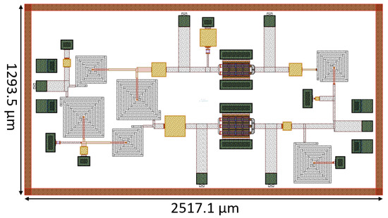 The layout of the DPA described in this paper was implemented using the 100 nm GaN-on-Si OMMIC process (D01GH). Figure 10 illustrates the final layout, which occupies an area of 2517.1 μm × 1293.5 μm (including PADs). The DC biasing PADs are located at the top and bottom of the chip, while Ground–Signal–Ground (GSG) RF input and output PADs are placed on the left and right sides. RF bias choke inductors were not included due to their high value.