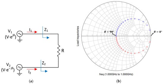To verify the above equations, the schematic in Figure 13a was simulated. As seen in Figure 13b, when is equal to 0-degree, the output power is null, and as a result, the load impedances act as an open circuit. However, when is 90-degrees, the load impedances are purely resistive (R/2) and the output power is maximum. For the rest of the values, the impedances present a substantial imaginary part, and therefore the efficiency decreases.
