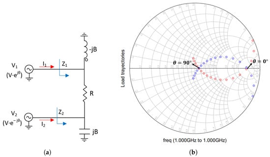 Load trajectories of the Outphasing PA for a phase sweep from 0-degree to 90-degree with compensation. (a) Schematic. (b) Simulation results. : blue trajectory and : red trajectory.