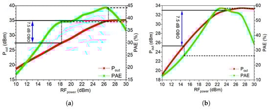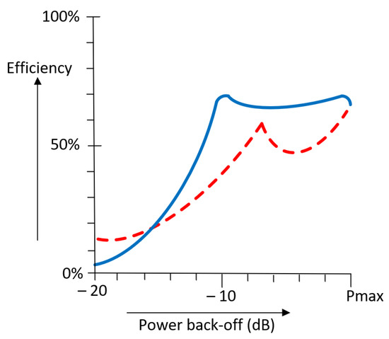 Figure 15 shows a comparison between the efficiencies of the Doherty and the outphasing topologies. Interestingly, the shape of the efficiency curve of the outphasing topology has two efficiency peaks like that of the Doherty. As in the Doherty PA, the outphasing efficiency changes depending on the desired OBO. Based on the previous analysis, it is evident that the outphasing architecture can provide a higher efficiency at back-off levels since it maintains higher values between the two peaks.