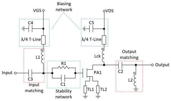 To ensure low-frequency stability, a stabilization network on the drain and gate bias lines was added as seen in Figure 16 [25]. Additionally, a stability network composed by capacitor C1 and resistor R1 was added at the gate of the transistor to guarantee the stability of the RF power transistor [7,21]. Finally, inductors L2 and L3 and capacitors C2 and C3 were used to match the input and the output of the transistor.