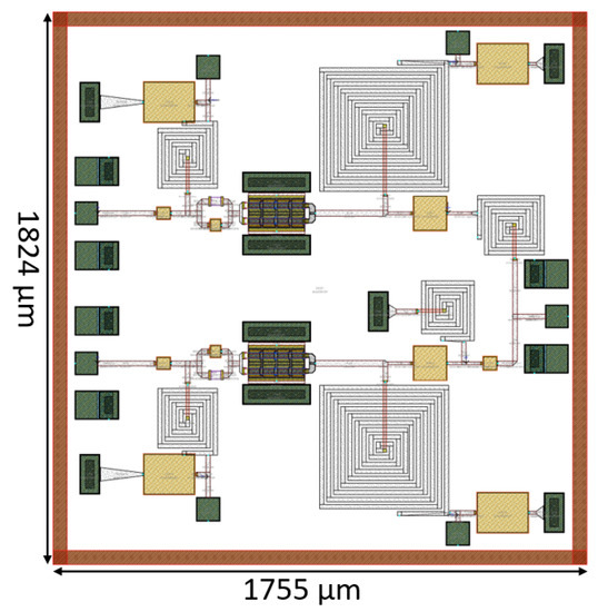 Figure 19 displays the layout of the outphasing power amplifier (PA), which occupies an area of 1755 μm × 1824 μm, including the DC, input and output PADs.