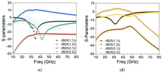 Figure 20a,b show the output power and PAE plotted as a function of the input power for the DPA and OPA, respectively. As can be seen in Figure 20a, the DPA provides a saturation power of 35 dBm and for that point, the PAE is 44.2%. For an OBO of 7.5 dB, the PAE of the DPA is 38.5%. On the other hand, Figure 20b shows that the saturation power of the OPA is 33 dBm and for that point, its efficiency is 58.3%, while at an OBO of 7.5 dB, the efficiency decreases to 26.1%. Figure 20c,d illustrate the small-signal post-layout simulation results for both PAs. At 3.6 GHz, the DPA demonstrates a gain of 9.4 dB, whereas the outphasing PA exhibits a gain of 10.4 dB. The outphasing PA shows superior input matching compared to the DPA, with an of −20.3 dB, contrasting with −8 dB for the DPA.
