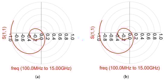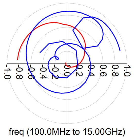 The stability analysis can be divided into two groups: even-mode stability and odd-mode stability analyses. In the even-mode stability analyses, the Rollett stability factor (K) and the Nyquist stability criteria were calculated and, in the odd-mode stability, the Nyquist stability criterion was calculated. From the S-parameter simulation results, the K factor was greater than 1 (K > 1) [21]. However, checking the K-factor of the overall design was not enough, because Rollett’s K-factor guarantees the stability throughout the entire amplifier while the Nyquist stability criterion is usually used to ensure the stability of each individual stage. Hence, instabilities may appear at low frequencies. According to the Nyquist stability criterion, instabilities can occur if the magnitude is greater than 1 (>1) and encircle the (−1 + 0j) the point in a counter-clockwise direction. For the even-mode stability analysis, we employed the method described in [29]. Figure 21 and Figure 22 present the OPA and DPA even-mode stability simulation results. As observed, both amplifiers exhibit stable behavior.