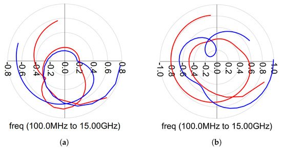 Doherty even-mode stability analysis for the input (in red) and the output (in blue). (a) Main amplifier. (b) Auxiliary amplifier.