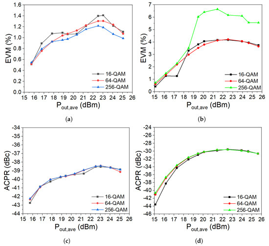 To further evaluate the amplifier performance, both PAs were tested with an OFDM modulated signal with 7.5 dB PAPR. The simulations were carried out at 3.6 GHz without using any digital predistortion, and the signal bandwidth was 100 MHz. Figure 25 shows the simulated error vector magnitude (EVM) and the adjacent channel power ratio (ACPR) (average of lower and upper channels) as a function of average output power () for different QAM signals. Figure 25a shows that for a low power level, the EVM was −40 dB (0.5%), and for a high-power level, the EVM reached up to −35 dB (1.05%) for the Doherty amplifier. Figure 25b shows that at low power, the EVM in the Outphasing amplifier was between −38 dB (0.7%) and −45 dB (0.4%), but for a higher power level, the EVM value increased significantly reaching up to −19 dB (6%) at some points for the 256-QAM signal. Figure 25c,d show the ACPR simulations of the Doherty and Outphasing amplifiers. As seen in the figures, the ACPR was not affected by the different modulations.