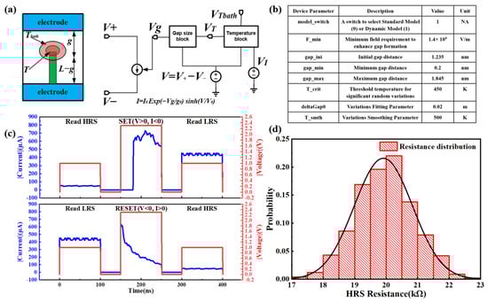 To illustrate the electrical characteristics and HRS variation of RRAM in this work, we refer to the RRAM Verilog-A model [19,20]. Besides describing the switching process of RRAM, this model also considers the stochastic property brought by the gap size of conductive filaments of RRAM and temperature. On the one hand, the main stochastic switching mechanisms are as follows: (i) The randomness of the ion migration process in the reset process, (ii) the variation of gap size, considering the multiple conductive filaments of RRAM. On the other hand, temperature can also strongly affect the growth rate and the amplitude of the conductive filament, resulting in some switching variation.