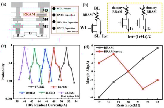 The RRAM cells of the 1T1R architecture can be integrated between the metal layers of M4 and M5 in the 28 nm logic process, as shown in Figure 2a. The box with a dashed orange line shows the structure diagram of a single HfOx-based RRAM device, which has a metal-resistive film-metal structure. The resistive HfOx layer is sandwiched by the two TiN electrodes. After the front-end-of-line (FEOL) process of transistor fabrication, the RRAM device is fabricated with the back-end-of-line (BEOL) process [21,22], as shown in the inset of Figure 2a. The resistive HfOx layer is deposited on the TiN bottom electrode by atomic layer deposition (ALD). The top electrode TiN is deposited by electron beam evaporation.