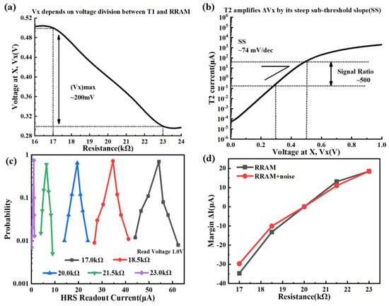 (a) Simulated voltage Vx versus HRS of RRAM. (b) Simulated transistor T2 current versus Vx at 17 and 23 kΩ; (c) Simulated readout current distribution of the HRS with steps of 1.5 kΩ; The current is collected using a read pulse of 1.0 V. (d) Simulated readout current margin of different resistances under the presence or absence of noise conditions.
