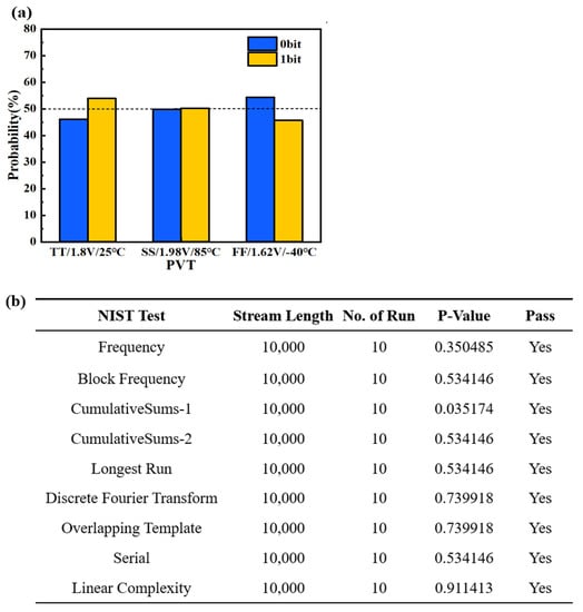 To verify the randomness characteristic of the 2T1R RRAM-based TRNG, the above-mentioned simulated HRS distribution data ranging from 17 to 23 kΩ are still used. As described in Section 2.1, we have obtained the simulated HRS distribution data with a median value of 20 kΩ based on the Verilog-A model, which consists of a series of random data of HRS. Assuming 20 kΩ as the resistance value of the reference cell, we can obtain a series of “0” bit or “1” bit of the TRNG output data. This means that the RRAM of each row and each column outputs one accurate bit in the 2T1R array. After a simulated sample of collecting about 100 k bits, the proportion of “0” bit or “1” bit converges to nearly 50% under various process corners and voltages and temperature (PVT) simulated conditions, as shown in Figure 5a. By collecting about 100 k bits as a simulated sample, 2T1R TRNG output bits can also pass the NIST test, including the frequency test, the cumulative sums test, the runs test, the discrete Fourier transform (spectral) test, etc., as shown in Figure 5b. These tests verify the randomness of the 2T1R RRAM-TRNG output bits. Additionally, the endurance of the RRAM device is generally larger than 103 [12,14]. Considering the 128 Kb RRAM array, the TRNG can generate around 108 random numbers. Even considering a 50% yield rate, the TRNG can generate around 5 × 107 random numbers, which meets the requirements of the TRNG.