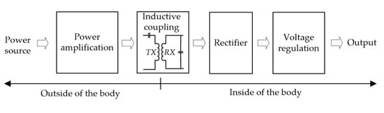 In recent years, implantable medical devices have played an increasingly important role in the monitoring and treatment of various diseases [1]. How to power such implantable medical devices safely and reliably is a popular current research topic. Traditional percutaneous wires require penetration of the skin, and battery power supplies are limited by their capacity and need surgery for replacement, which is prone to cause infection and bring a lot of inconvenience to the lives of patients. Wireless power transfer can eliminate the dependence on percutaneous wires, and the service life of implanted devices can avoid becoming limited by battery capacity, thus producing a very potential power supply method. Over the past few decades, several wireless power transfer techniques have been proposed for powering implanted medical devices, including inductive coupling [2], capacitive coupling [3,4], ultrasound [5,6] and far-field electromagnetic radiation [7]. In general, inductive coupling and capacitive coupling techniques consume less volume, while inductive coupling and ultrasonic transmission are more efficient. In addition, inductive coupling has less tissue absorption and is more liable to transfer higher power [8]. Among these techniques, inductive coupling has been widely studied in the field of wireless power transfer for implantable medical devices due to its effectiveness, robustness and safety.