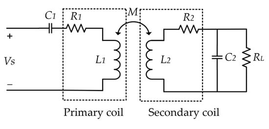 A general equivalent circuit model of inductive coupling is shown in Figure 2. , , and are the self-inductance and parasitic resistance of the primary and secondary coils, respectively, and is the mutual inductance between the coils. The introduction of and makes the primary coil and the secondary coil work at the same resonant angle frequency , respectively, in series resonance and parallel resonance states, improving the power transfer efficiency. represents the equivalent load, and represents the driving source.