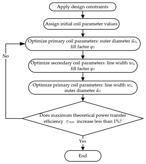 The literature [13] gives a complete coil design flow for a given load, based on (1) deriving the maximum power transfer efficiency for that load. However, once the load changes, the entire process needs to be rerun. In contrast, this paper decouples the coil optimization from an actual load by introducing the optimal resonant load transformation to convert the actual load to the optimal load that satisfies. (2) As a result, the coil optimization process is no longer specific to a particular load. When the actual load changes, the optimization process does not need to be rerun entirely. Instead, only the impedance transformation network needs to be updated. Moreover, this approach uses (3) the objective function and has the advantage of a clear optimization goal. Whether the algorithm iteration is reasonable can be easily judged by whether it is approaching the theoretical limit. This is different from the previous work, which only aims to improve and as much as possible, and the final result depends on the effectiveness of the iterative algorithm. Figure 4 shows a flowchart using (4)–(10) to design and optimize the coils.