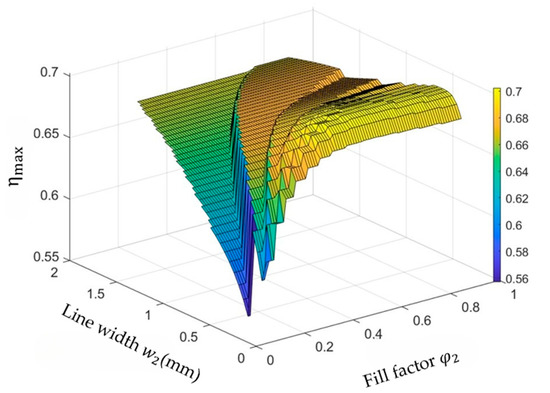 After optimizing the secondary coil, the line width and outer diameter of the primary coil can be further tuned to boost the maximum power transfer efficiency, since the size of the primary coil is less constrained. Increasing can reduce and increase , and also result in larger while keeping constant. The change in with and is shown in Figure 7. When = 40 mm and = 1.3 mm, = 72.2%.