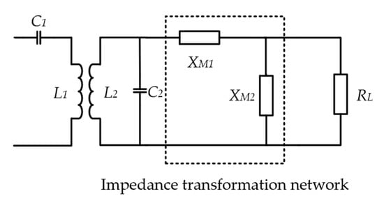 In order to make the equivalent load seen by the secondary coil loop close to the optimal load, an impedance transformation network is inserted between the secondary coil and the actual load to achieve the optimal resonant load transformation. In this way the actual load impedance is converted to the optimal load given in (2), which not only keeps the secondary coil resonant with a high value, but also facilitates the load to extract energy from the equivalent current source [19]. This is different from traditional conjugate impedance matching. Conjugate matching aims to reduce energy reflection on the transmission line, and the theoretical upper limit of transmission efficiency is only 50% [17]. In addition, the three-coil or four-coil structures proposed in the literature [15,16] essentially implement load transformation by introducing additional coils to reduce the influence of load and source impedance on the power transfer efficiency, but it will obviously increase the device size, which is severely limited by implantable space and difficult to adjust.