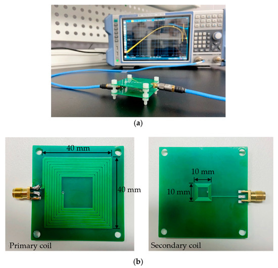The fabricated PCB coils and the inductive coupling test setup are shown in Figure 10. Two-port S-parameters of the inductive coupling are first measured using a vector network analyzer (VNA), and then converted to Z-parameters. This allows the electrical parameters of the coils to be easily extracted according to the following equations: