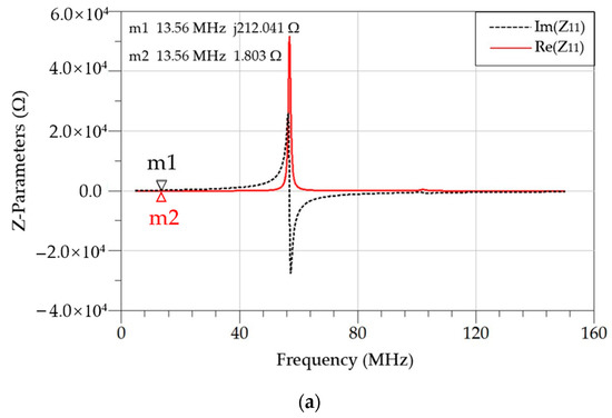 The measured Z-parameters are shown in Figure 11, and the extracted electrical parameters are listed in Table 3. It is worth noting that the frequency point where the sharp peak of the real part curve and the abrupt transition from positive to negative of the imaginary part curve of the Z-parameters indicates the self-resonant frequency (SRF) of the coil. It can be seen that the operating frequency of 13.56 MHz is at least three times lower than the SRF for both the primary and secondary coils, which means the coils can work stably at the operating frequency.