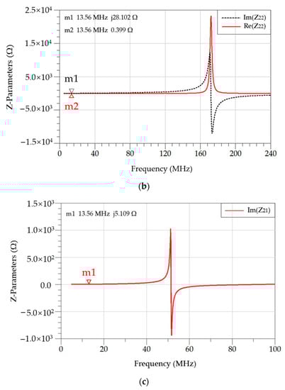 Measured Z-parameters. (a) The real and imaginary part curves of of the primary coil; (b) the real and imaginary part curves of of the secondary coil; (c) the imaginary part curve of , representing the mutual inductance.