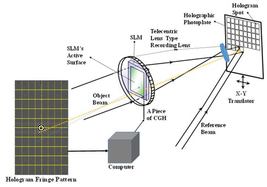 A hologram is a three-dimensional photograph of an object that is recorded by a coherent laser beam []. It consists of interference fringes formed by the interference between the reference and object beams, which stem from the laser beam. The digital recording of holograms started with the Zebra hologram []. The Zebra hologram is a three-dimensional photograph generated from a two-dimensional array of hologram spots. Each hologram spot in the array is the hologram made from an object that is a view image in a multiview image set that has the same array dimensions as the hologram spot array. This Zebra hologram recording method was utilized to record a microlens array on a photopolymer film [] by replacing each view image with the computer-generated hologram (CGH) [,] of a lens or spherical mirror. This method was further developed as a wavefront printing method for recording digital holographic optical elements (HOEs) []. The traditional method for creating an HOE with an optical component is recording by interfering with either the rays reflected from or transmitted through the component itself or the object beam with the laser beam incident to the component as the reference beam. This is the typical method for recording analog-type HOEs []. However, this recording method has the serious problem of requiring optical components of various sizes and focal lengths to record HOEs with the desired focal lengths and sizes. As the desired HOE size increases, recording becomes more difficult because it requires a larger component with the desired focal length, a higher-power laser beam, and a larger space in which to install the recording setup. The wavefront recording method is intended to overcome this problem. It holographically records the hologram fringe pattern of the optical component instead of the rays from the object itself on a holographic photoplate or photographic film. Using this method, the fringe pattern is generated by a computer, i.e., a computer-generated hologram (CGH), and this is segmented equally into a desired number of pieces. Each piece in the segmented CGH is focused with a desired spot size equal to that of the beam from the object on the plate or film and is recorded as a hologram spot using a collimated reference beam that is directly incident to the plate/film with a designed incident angle. For this purpose, each fringe piece is displayed on a spatial light modulator (SLM) [] and projected through focusing optics onto the plate/film, which is also virtually segmented into the same number of segments as the fringe pieces. In this way, the relative position of the fringe piece in the segmented CGH becomes the same as that of its hologram spot in the plate or film. Hence, the plate/film consists of a hologram spot array. When a reconstructed beam illuminates the plate/film, each hologram spot will reconstruct its fringe piece, and the complete fringe pattern will be reconstructed to work as the optical component represented by the fringe pattern. Hence, the plate/film becomes a digital HOE. In theory, this digital HOE has no size limit if the available photoplate or photographic film is the same size as the desired HOE because the CGH can be made to have any size. Because the CGH of the optical components, such as the lens and the spherical mirror, has the same fringe pattern as the Fresnel zone plate [], the zone plate can be used instead of the hologram fringe pattern.