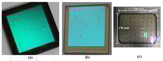 The two digital and analog HOE samples. Arrows in the samples indicate defective hologram points. These were mainly underdeveloped: (a) sample 1, (b) sample 2, and (c) analog HOE.
