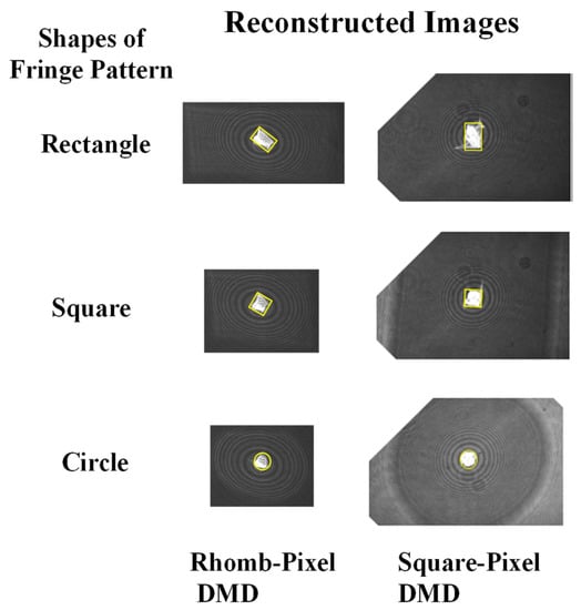 Reconstructed images from the holograms displayed on both rhomb and square. The image shape is the same as the hologram shape displayed on the DMDs.