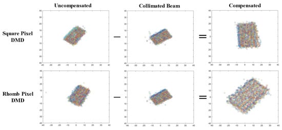 Wavefront deviation distributions obtained by plotting the quadrant value of each of the 69 × 43 spots. The compensated distribution means that they are rotated 45° compared with the rotation axis of their corresponding DMDs.