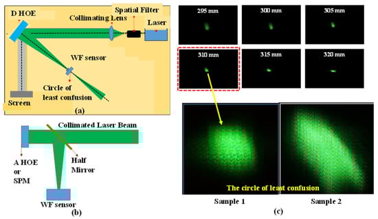 The two different optical setups used to measure the focal spot size and wavefront aberrations of the test subjects: (a) setup for the digitally recorded HOE, (b) setup for the analog HOE and SPM, and (c) the reflected beam shape changes close to the focusing position.