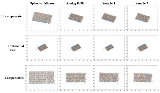 Wavefront aberrations of the samples, drawn by plotting the spot positions, compared with those of the spherical mirror and the analog HOE. The aberration distributions of the HOEs and the spherical mirror reveal rectangular shapes as the reconstructed images of the point hologram.