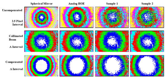The phase map in the top row was drawn using a 2.5-pixel interval, and those for the collimated and compensated beams in the middle and bottom rows were drawn using the wavelength interval. These show that the right-hand edge of each map was noisier than the left side. This might be caused by some scratches on the right-hand edge of the microlens array. When the 50 mm collimated beam was incident to the spherical mirror with a 220 mm focal length, to the analog HOE with 500 mm focal length, and to the digital HOE samples with 300 mm focal lengths, the maximum converging angles of the reflected and diffracted beams should be 6.48°, 2.86°, and 4.6°, respectively. However, the wavefront sensor could only detect a wavefront deviation up to ° to 4.28° in the horizontal direction because of the 16:9 aspect ratio of the image detector in the mirrorless camera. When the diagonal directions were considered, the aberrations up to ° to 6.04° can be detected. Therefore, the sensor was suitable for the HOEs but was insufficient for the spherical mirror. As shown in Figure 8, the uncompensated first row images show 12 rings, including one at the corners, for the spherical mirror, 8 rings for the analog HOE, and 7 rings for the two digital HOE samples in their horizontal direction. However, the rings for the two samples reveal barely identifiable boundaries compared with those of the spherical mirror and analog HOE. In the case of the compensated beams, nine very sharp concentric circular rings were identified for the spherical mirror, six rings for the analog HOE and sample 1, and five rings for sample 2. Because the last ring of each map was shown separately and the center of the rings was slightly shifted to the right-hand side, the actual numbers of rings should be 4.5 for the analog HOE, and 4 for samples 1 and 2. Therefore, the converging angles of the spherical mirror, analog HOE, sample 1, and sample 2 would be 3.96°, 2.80°, 2.64°, and 2.64°, respectively. The following observations were made regarding the maximum converging angles of the subjects: (1) the 3.96° for the spherical mirror was much smaller than its maximum, because the 77 × 77 pixel array was insufficient to cover the convergence of the mirror; (2) the 2.80° for the analog HOE closely matches its maximum; and (3) the 2.64° for samples 1 and 2 was smaller than their maximum because their converging power was weaker. This is why the focused beam sizes of samples 1 and 2 were in the range of 5 to 9.6 mm2. Figure 8 also shows that the ring boundaries of the analog HOE were better defined and less noisy, i.e., a smaller number of different color points in each ring compared with the samples. The diameters of the white circles in the images increased in the order of spherical mirror, analog HOE, sample 1, and sample 2. These features indicated that the analog HOE converged more sharply than the samples even though its focal length was 1.7 (50/30) times longer than those of the samples, and the spherical mirror had a very sharply defined circular focus point. The radius of these rings was 11.9, 16.8, 20.5, 23.7, 26.6, 29.1, 31.4, 33.6, and 35.6 pixels, as shown in Table 1. From the sixth ring, the pixel increment corresponding to the 1 λ path length increment became less than 2.5 pixels. This number corresponded to the pixel number given in Figure 7.