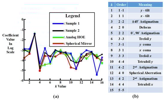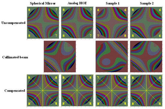 where is the 15 element matrix of A is a two-dimensional matrix form of , is a transpose matrix of A, and B is a two-dimensional matrix form of . Figure 9 compares 15 coefficients of the Zernike polynomials, i.e., n = 15 for the four test subjects, excluding the piston, i.e., the constant term. It also shows the optical aberration represented by each coefficient. In Figure 9a, the y-axis of the graph is in log scale and the x-axis represents the k value. It shows that the spherical mirror had the smallest values and was followed by the analog HOE, sample 1, and sample 2 for most coefficient values, even though they were mostly in the range of 10−3. There was little difference in the coefficient values for the subjects. The highest coefficient value was , i.e., 45° astigmatism term. The wavefronts of the subjects reconstructed from the coefficients are shown in Figure 10. Because the polynomials are defined within a unit circle, in each image the reconstructed wavefront of the subject is drawn within the circle. The wavefront aberrations of the subjects were within the wavelength range of −0.04 λ~0.04 λ. The 45° diagonal represents 0.0 to −0.04 λ and 135° 0.0 to 0.04 λ. The colored segments in each diagonal represent a ±0.005 λ interval. Consequently, there can be eight colored segments for each direction of each wavefront. The color in the center of the circle and outside it represents 0.0 λ. The wavefront aberration increases further from the center of the circle. The number of colored segments specified in each corner of each square reveals the symmetricity of the wavefront. As indicated by the numbers in each wavefront, there were eight colored segments for the compensated wavefronts of the subjects, with the exception of sample 1. Sample 1 revealed seven colored segments on its upper left-hand side. According to the size and shape of the colored segments in the circumference, the wavefront symmetricity decreases in the order of the spherical mirror, analog HOE, sample 2, and sample 1. However, the overall symmetricity of the wavefront decreases in the order of the spherical mirror, analog HOE, and samples 1 and 2, as indicated by the two diagonal lines and the horizontal and vertical bisect lines. The pin-cushion pattern in the middle of each wavefront reveals the decrease. The symmetricities of the opposite-facing patterns along the lines deteriorate further between the spherical mirror to sample 2. This means that the reconstructed wavefronts of samples 1 and 2 were more distorted. It is also noticeable that the uncompensated wavefronts were influenced by their corresponding collimated beams. This is clearly demonstrated by the wavefronts of samples 1 and 2. The wavefronts of the uncompensated and collimated beams for sample 1 were simply the sample 2 wavefronts rotated 180°. The compensated wavefronts did not reveal this property.