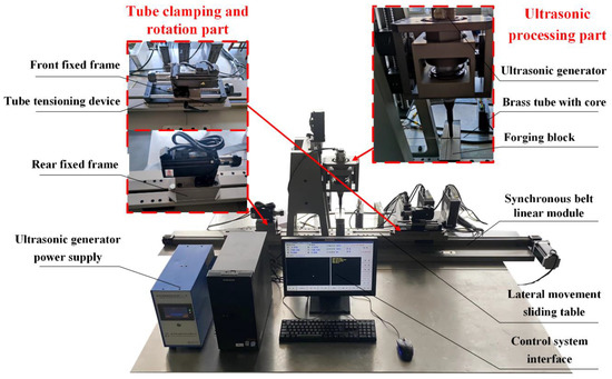 Figure 1 shows the developed experimental equipment for ultrasonic vibration preparation of ultra-fine brass tube electrodes. The mechanical structure of the equipment mainly consists of three parts: the ultrasonic processing part, the tube clamping and rotation part, and the processing platform transverse movement part. The ultrasonic processing part mainly consists of an ultrasonic generator and machining gap adjustment device. The ultrasonic generator, amplitude rod, transducer and ultrasonic forging head constitute the ultrasonic generator. The machining gap adjustment device consists of an AC servo motor and ball screw module, which provides the ultrasonic vibration required for processing and adjusts the machining gap in the process. The tube clamping and rotation part consists of a precision chuck, two AC servo motors and a tube tensioning device. The brass tube with core is clamped on the two AC servo motors through the precision chuck to provide the rotational movement required for processing. The lateral movement part of the processing platform consists of a stepper motor, a synchronous belt linear module and a lateral movement sliding table. In addition, the rear fixed frame can be moved on the lateral movement sliding table, and by adjusting the distance between it and the front fixed frame, tube workpieces of different lengths can be processed. The interface of the control system is written in Delphi language, and the control system program is written in VC++6.0. The control of the AC servo motor is installed symmetrically on the same axis. The stepping motor in the horizontal direction and the AC servo motor in the vertical direction can be realized simultaneously, which makes the tube rotate and reciprocate, and the ultrasonic forging head moves linearly perpendicular to the processing plane. The performance of the experimental equipment for ultrasonic vibration preparation of ultra-fine copper tube electrodes is shown in Table 1.