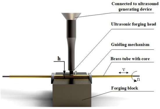 In the field of EDM cylindrical electrode machining, there are many methods: for example, using the method of electrical discharge drilling (EDD), ultra-fine WC-6% Co cylindrical electrodes with an aspect ratio of 45 can be machined [6]; additionally, using the method of multi-EDM grinding, cylindrical electrodes with a length of 0.6 mm and a diameter of 20 μm can be machined [7]. Other methods such as Block electrode discharge grinding (BEDG) and Electrochemical Etching [8] are also widely used, and the processing of cylindrical electrodes is also developing in the direction of ultrafine, high aspect ratio and high-quality electrode materials. In contrast, compared with the processing of cylindrical electrodes, the preparation methods of ultrafine tube electrodes have rarely been studied, and there are few studies in the field of automated processing of copper tube electrodes with high aspect ratios. At present, the widely used production process of ultra-fine copper tube is as follows: (1) insert a steel core inside the thicker copper tube blank, and compress the copper tube blank by mechanical rolling or drawing to obtain a finer copper tube with a core; (2) stress relieving annealing; (3) roll the copper tube with a core by mechanical knocking to separate the inner wall of the copper tube from the steel core, and withdraw the steel core to obtain a finer copper tube that is decored; (4) repeat the above process until the desired outer diameter is obtained. The most important step here is the decoring. Mechanical knocking decoring efficiency is low, the yield rate is low, the preparation area is large, it is difficult to achieve automation, etc. The decoring force in the processing of copper tube electrode is often very large and can only be done by machines, so we innovatively try to use ultrasonic vibration to replace mechanical knocking to achieve the decoring of copper tubes with cores. The decoring force is significantly reduced after processing, and the steel core can even be easily removed by hand; at the same time, the surface of the processed copper tube electrode has a better integrity, and the processing effect is good. Ultrasound is widely used in welding, milling, grinding, drilling, laser processing and other fields [9,10,11,12], but mainly for auxiliary manufacturing. Direct use of ultrasound for mechanical processing is not yet common in the field of machining. There is a small amount of research on processing metal materials directly using ultrasonic vibration—for example, ultrasonic impact treatment [13], which is closer to the principle of shot peening, can make use of the advantages of high ultrasonic vibration frequency and low force to make the surface of the workpiece undergo small plastic deformation and surface grain refinement, thus enhancing the surface quality and improving the mechanical properties [14]. Ultrasonic impact treatment has the advantages of high ultrasonic vibration frequency, low force, nano-scale deformation, strengthening the surface of metal materials, significantly improving the surface integrity of metal materials, generating beneficial residual stress on the surface, improving the mechanical properties of the surface, etc. It is considered one of the most promising technologies in the cold treatment of metal materials [15]. Therefore, we tried to use ultrasonic vibration instead of mechanical knocking to decore brass tubes with cores, which could not only result in automatic and high-efficiency production of ultra-fine copper tube electrodes but could also improve the surface quality of the processed copper tube electrodes and prolong the service life of the electrodes.
