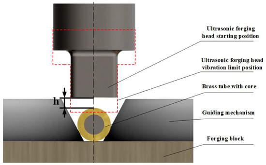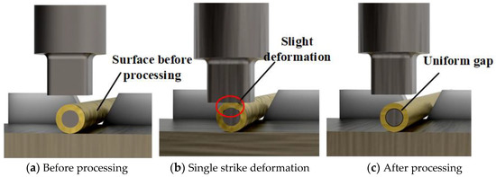 The principle of ultrasonic processing of brass tube electrodes is shown in Figure 2 below. After roller pressing, both sides of the brass tube with core are fixed on two servo motors through precision collets to provide rotary motion. The guiding mechanism prevents the brass tube with core from rotating in the process of lateral jump and also provides alignment and guidance. The lower part of the brass tube with core is the forging block. The upper part of the ultrasonic generator, through the transducer mechanism to amplify the vibration, and finally through the ultrasonic forging head to the brass tube with core is processed by the ultrasonic forging head, and the brass tube with core does transverse reciprocating motion during the processing. The processing process and deformation principle is as follows: After the roller press, the brass tube and steel core are closely combined and difficult to separate, as shown in Figure 3a. The processing gap h exists between the brass tube with core and the ultrasonic forging head before the processing starts, and the ultrasonic forging head will ultrasonically strike the surface of the brass tube with core after the processing starts; a single strike is shown in Figure 3b. At this time, under pressure, the brass tube undergoes a small plastic deformation. A gap is generated between the core and the external brass tube due to the high rotational speed of the brass tube with core and the high frequency of ultrasonic vibration. The final deformation of the brass tube shape cross-section is close to a circle, and the external brass tube and the iron core appear to have a uniform gap. The brass tube and the iron core separation force are significantly reduced and the results are shown in Figure 3c. At the same time, due to the ultrasonic processing of the ultrasonic forging head on the external brass tube, forging numerous times makes the surface reinforced. Some defects, scratches and rust on the original surface are partially or completely removed and the surface quality is greatly improved, which can significantly improve the service life of the processed brass tube electrode.