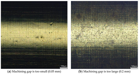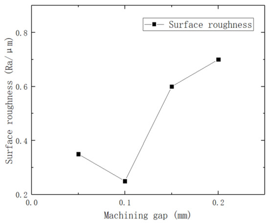 To investigate the effect of machining gap on the surface roughness of brass tube electrodes, a total of five sets of experiments were conducted in 0.05 mm increments with other parameters fixed, and the experimental parameters are shown in Table 4. The effect of different machining gaps on surface roughness is shown in Figure 5.