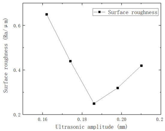 To investigate the effect of ultrasonic amplitude on the surface roughness of brass tube electrodes, an experiment was conducted in increments of 0.012 mm with other parameters fixed. The experimental parameters are shown in Table 5, and the effect of different ultrasonic amplitudes on surface roughness is shown in Figure 7.