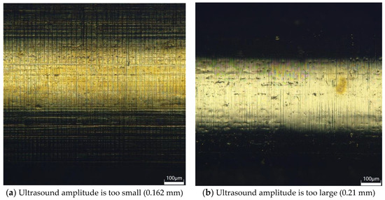 Figure 7 shows that when the ultrasonic amplitude is too small, the surface processing of the brass tube electrode is not complete; the surface roughness is reduced compared with the original surface, but it is not optimal. Figure 8a is the 3D digital micrograph of the surface of the brass tube electrode at the ultrasonic amplitude of 0.162 mm. The surface of the brass tube electrode still has some unremoved patina, the surface metal luster of the electrode is not obvious, and the residual defects still exist; thus, processing is not complete. With increasing ultrasonic amplitude, the surface roughness of the brass tube electrode obviously decreases, and the surface roughness reaches an optimal 0.25 μm when the ultrasonic amplitude is 0.186 mm. When the amplitude of ultrasonic vibration reaches 0.21 mm, the knocking of ultrasonic vibration sometimes also causes the processed brass tube electrode to break, which directly leads to processing failure. Figure 8b shows the 3D digital micrograph of the brass tube electrode surface at the ultrasonic amplitude of 0.21 mm, which shows that there are many craters on the electrode surface caused by excessive deformation.
