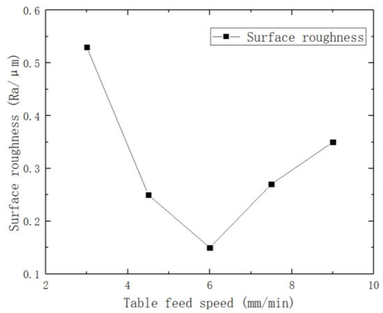 To investigate the effect of table feed speed on the surface roughness of brass tube electrodes, an experiment was conducted in increments of 1.5 mm/min with other parameters fixed. The experimental parameters are shown in Table 6, and the effect of different table feed speeds on surface roughness is shown in Figure 9.