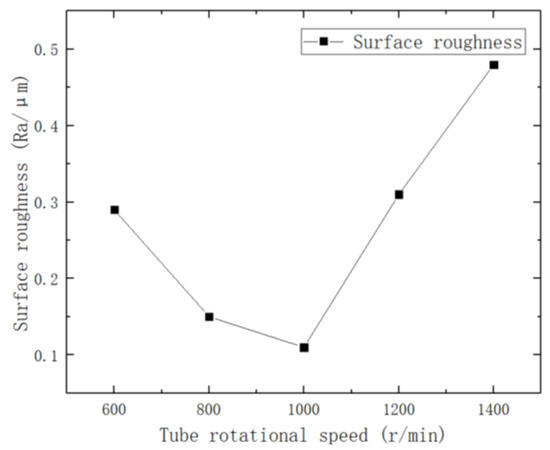 To investigate the effect of tube rotation speed on the surface roughness of brass tube electrodes, an experiment was conducted in 200 r/min increments with other parameters fixed. The experimental parameters are shown in Table 7, and the effect of different tube rotation speeds on surface roughness is shown in Figure 10.