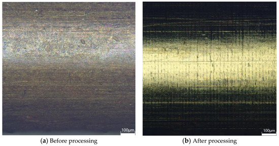 Figure 12a shows the 3D digital micrograph of the surface of the brass tube with core of 1.206 mm inner diameter and 1.276 mm outer diameter before ultrasonic machining. It is obvious that the surface of the brass tube has been oxidized, and there are a lot of defects such as pits and scratches caused by mechanical rolling or drawing. The surface roughness is 1.21 μm, which will shorten the service life of the brass tube electrode and seriously affect the surface quality of the workpiece after EDM. Figure 12b shows the 3D digital micrograph of the surface of the brass tube electrode after ultrasonic machining, with the machining parameters of 0.1 mm gap, 0.186 mm ultrasonic amplitude, 6 mm/min table feed speed, 1000 r/min tube rotation speed, and reciprocating machining two times. The oxide layer on the surface of the brass tube electrode was completely removed, and the mechanical defects produced by the previous process were also removed. The surface organization was dense and bright, and the surface roughness reached 0.11 μm, which achieved good processing results.