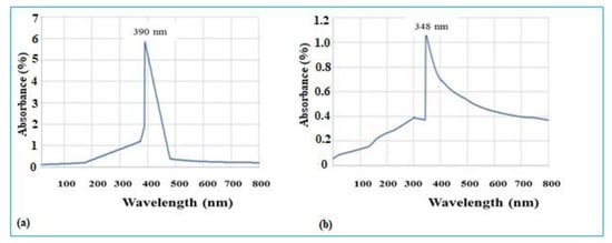 After the reduction process, the green synthesis of ZnONPs was confirmed by observing the respective absorption spectra at 100 to 800 nm wavelength. The UV-Vis spectra of synthesized ZnO NPs are presented in Figure 2a,b. At pH 5, the UV spectra showed an absorption peak at 390 nm, while at pH 9, the absorption peak was noted at 348 nm. At pH 9, the synthesis was noted earlier than at pH 5. Moreover, the formation of NPs was highly detected at 9 pH. The present study correlates with previous studies in which researchers confirmed the absorption peaks at 340–390 nm for ZnONPs [].