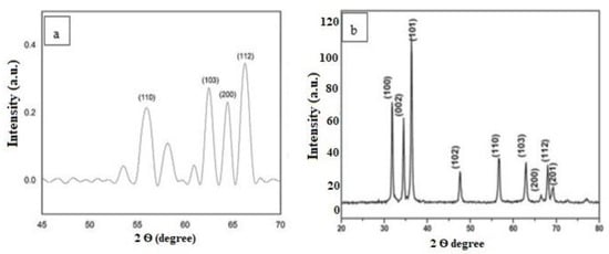 Further studies were committed by using XRD to explain the nature of nanoparticles (Figure 3a,b). The peak position was consistent with metallic ZnO NPs. This technique was based on projecting a monochromatic X-ray beam onto the material. Bragg reflection with 2θ values for 56.8°, 62.9°, 64.05°, and 66.14° and 30°, 36°, 39°, 47°, 55°, 63°, and 68° were obtained at pH 5 and 9, respectively, and the Scherrer equation was used to calculate the size of NPs. The strong peak indicates the ZnO-NPs the planes of the XRD pattern have good agreement with (JCPDS card no. 5-0664). The average calculated diameter of nanoparticles is between 47 and 45 nm at pH 5 and pH 9. Other bilges showed impurities such as the phyto-chemicals used in the synthesis of NPs [].