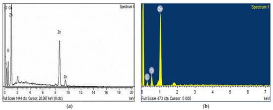 SEM was used for the morphological description of ZnONPs, which revealed that the appearance was less spherical at pH 5 (Figure 4a) while becoming reduced and more circular at pH 9 (Figure 4b). The size ranges from 47 nm for pH 5 to 45 nm for pH 9. These results also agree with the previous reports [,]. The surface area and biological activities tend to increase with the decrease in size of NPs []. Thus, it can be suggested that NP synthesis at pH 9 has a significant yield of harvesting. For confirmation of elemental analysis, EDX was performed (Figure 5a,b). The EDX results confirmed the presence of ZnO, and these findings are similar to previously documented results [].