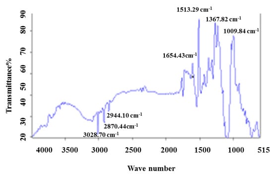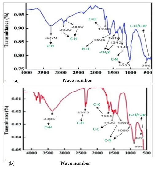 FTIR was used to recognize various chemical functional groups associated with the synthesis of ZnONPs at pH 5 and 9. The spectra confirmed that the reduction that occurred in zinc oxide ions to zinc oxide nanoparticles was due to the reducing substance in plant extract. The peaks centered at 3385 cm−1, 3279 cm−1, 2920 cm−1, and 2850 cm−1 indicated O–H and C–H stretching. Peaks located at 2375 cm−1, 1740 cm−1, and 1655 cm−1 correspond to C–H, C=O, and C=C bends. Similarly, peaks at 1596 cm−1, 1420 cm−1, 1080 cm−1, and 630 cm−1 signify N–H, C–C, C–N, and C–Cl/C–Br bonds from biogenic ZnO NPs (Figure 6a,b). The FTIR of only plants was also performed (Figure 7).
